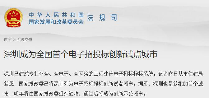 2016年,深圳市正式通過了國家權(quán)威檢測認(rèn)證,成為了全國電子招標(biāo)投標(biāo)試點(diǎn)城市。也真正標(biāo)志著深圳走向了國到了電子化招標(biāo)投標(biāo)的前列。