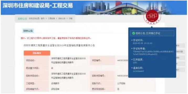 深圳市建設(shè)工程招投標(biāo)平臺(tái)以“區(qū)塊鏈+招標(biāo)投標(biāo)”的模式,成功實(shí)現(xiàn)了深圳建設(shè)工程全流程數(shù)據(jù)的“及時(shí)存證,實(shí)時(shí)核驗(yàn)”。