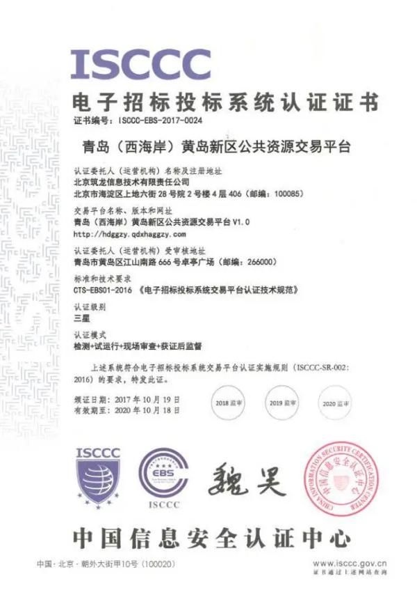 2017年10月,"青島(西海岸)黃島新區(qū)公共資源交易平臺“獲得中國信息安全認(rèn)證中心檢測認(rèn)證、國家電子交易平臺最高級別認(rèn)證——電子招標(biāo)投標(biāo)系統(tǒng)三星級認(rèn)證證書。成為山東省首家正式通過國家最高級別檢測認(rèn)證的電子交易平臺。