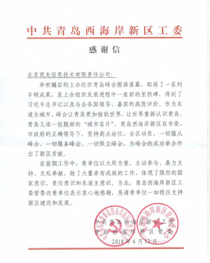 2018年6月,上海合作組織成員國元首理事會第十八次會議在山東省青島市舉行。峰會期間,為確保青島西海岸新區(qū)公共資源交易網(wǎng)網(wǎng)站安全、可靠,穩(wěn)定的運行,北京筑龍想中心所想,為青島西海岸新區(qū)公共資源交易網(wǎng)保駕護航。對此,中共青島市委青島西海岸新區(qū)工作委員會及青島西海岸新區(qū)管理委員會特發(fā)來感謝信,表彰北京筑龍在峰會期間所做的大量卓有成效的工作,體現(xiàn)了強烈的國家意識、責(zé)任意識和東道主意識