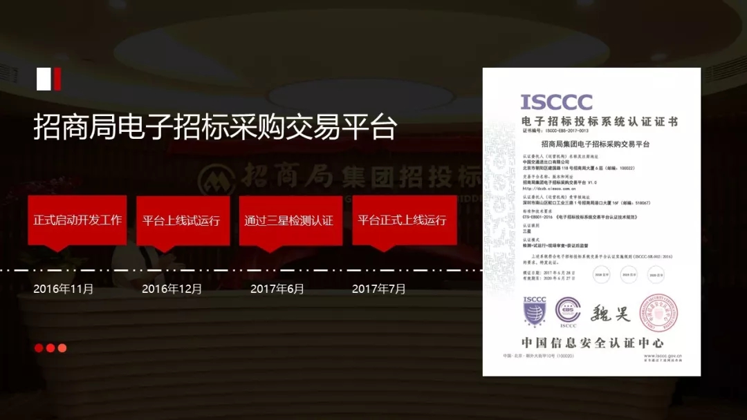 2016年12月29日,“招商局集團(tuán)電子招標(biāo)采購(gòu)交易平臺(tái)”正式上線運(yùn)行。截止2018年9月20日,平臺(tái)注冊(cè)用戶達(dá)35918家,招標(biāo)采購(gòu)平臺(tái)上線項(xiàng)目3775個(gè),非招標(biāo)采購(gòu)平臺(tái)上線項(xiàng)目25607個(gè),累計(jì)材料、貨物、設(shè)備報(bào)價(jià)數(shù)301920條,累計(jì)上線金額856.4億元。值得一提的是,“招商局集團(tuán)電子招標(biāo)采購(gòu)交易平臺(tái)”是筑龍公司為招商局集團(tuán)量身打造的專業(yè)平臺(tái),該平臺(tái)從簽署開(kāi)發(fā)到正式上線使用,只經(jīng)歷了短短40天的時(shí)間。