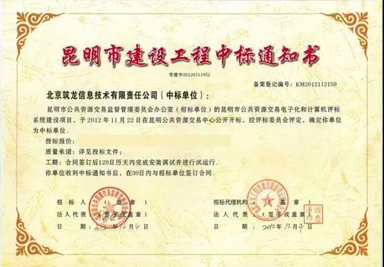 2012年11月,公司在激烈的競爭中脫穎而出,成功中標(biāo)昆明市公共資源交易電子化平臺建設(shè)。