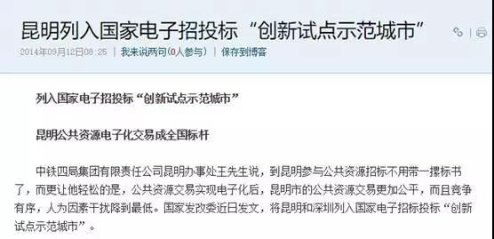 2014年,國家發(fā)展改革委相繼批復(fù)深圳市、昆明市為國家電子招標(biāo)投標(biāo)創(chuàng)新試點城市。標(biāo)志著電子招標(biāo)投標(biāo)系統(tǒng)全國范圍內(nèi)有了可借鑒和參考的樣例模板,同時也是對其在招標(biāo)投標(biāo)電子化積極探索上的認(rèn)可和肯定。