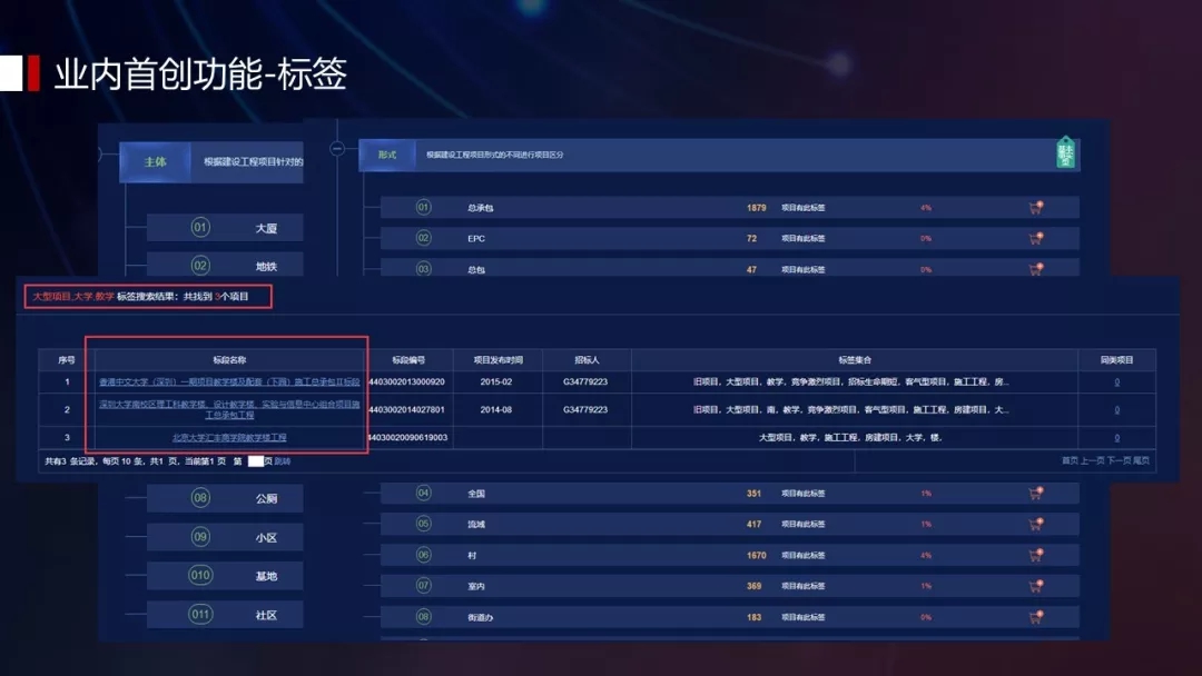 關(guān)于標(biāo)簽體系:標(biāo)簽,其實(shí)就是一個(gè)提煉特征的過程,通過項(xiàng)目的標(biāo)簽,可以快速圈定目標(biāo)范圍,當(dāng)標(biāo)簽越來越多,定位條件越來越準(zhǔn)確的時(shí)候,就可以自動(dòng)的識(shí)別招標(biāo)要求、偏好、自動(dòng)識(shí)別投標(biāo)人特征、從而自動(dòng)去匹配適合招標(biāo)項(xiàng)目的投標(biāo)人,這個(gè)流程也就是我們常說的智慧采購。所以說筑龍的招標(biāo)采購大數(shù)據(jù)平臺(tái)在建設(shè)初期就考慮到了這個(gè)非常有意義的功能。