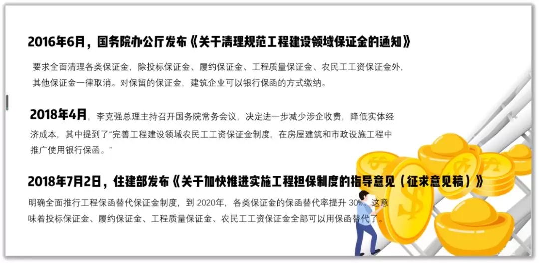 隨后,關(guān)于清理保證金和加快工程擔(dān)保等一系列政策連續(xù)出臺(tái)和實(shí)施,進(jìn)一步促進(jìn)各地區(qū)深化改革,加快推進(jìn)各類金融服務(wù)產(chǎn)品的開發(fā)和應(yīng)用。