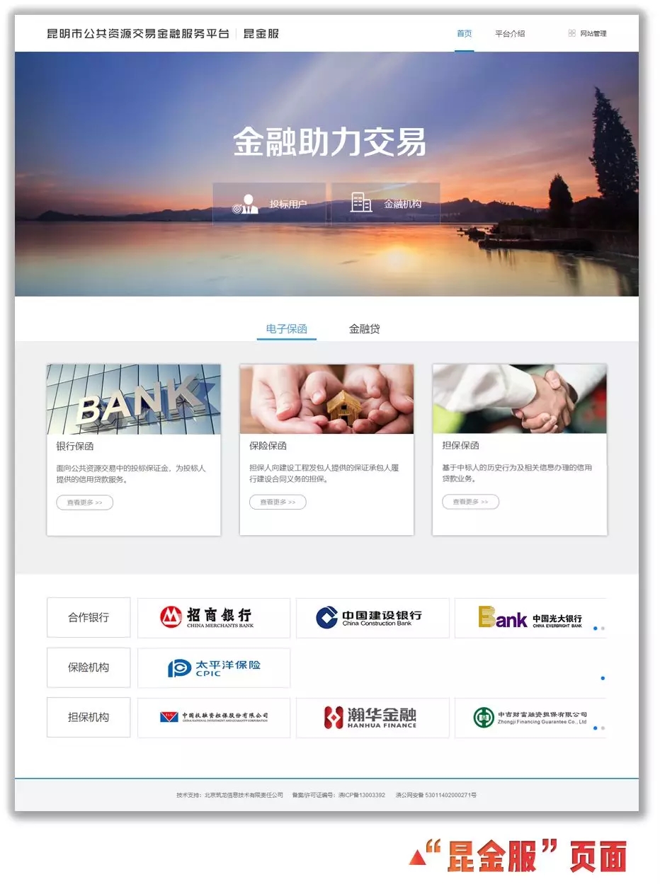作為提升昆明市公共資源交易服務(wù)水平的重要舉措之一,“昆金服”上線后將為投標(biāo)人提供包含投標(biāo)貸、中標(biāo)貸、履約貸、銀行保函、保險(xiǎn)保函、擔(dān)保保函等多種金融服務(wù)產(chǎn)品。