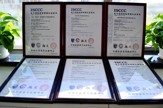 2017年10月19日"青島(西海岸)黃島新區(qū)公共資源交易平臺(tái)“正式通過中國(guó)信息安全認(rèn)證中心檢測(cè)認(rèn)證,并獲得國(guó)家電子交易平臺(tái)最高級(jí)別——三星級(jí)認(rèn)證證書,成為山東省首家通過國(guó)家級(jí)檢測(cè)認(rèn)證的公共資源電子化交易平臺(tái)。