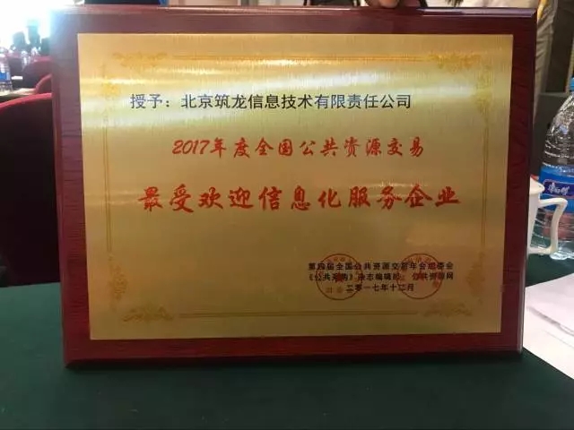 在公共資源交易整合工作迅速推進的2017年,國家要求公共服務體系和綜合監(jiān)督體系全面發(fā)揮作用,實現招標投標行業(yè)向信息化、智能化轉型?!盎ヂ摼W+”“大數據”“人工智能”越來越多的應用到公共資源交易活動當中來,“2017全國公共資源交易獎項評選”于2017年12月7日晚落下帷幕。該獎項旨在推廣公共資源交易新科技新技術,表彰本年度公共資源交易供應商先進單位。北京筑龍信息技術有限責任公司榮獲“2017年度公共資源交易最受歡迎信息化服務企業(yè)”。