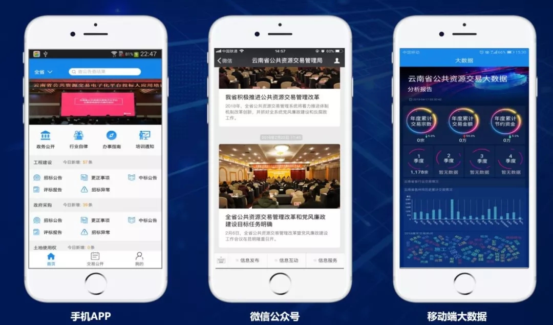 同時,云南省開發(fā)了手機APP、微信公眾號和移動端大數(shù)據(jù),實現(xiàn)“一微一端”移動互聯(lián)公共資源交易。