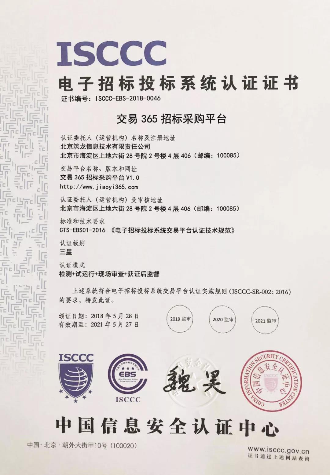 5月28日,北京筑龍旗下第三方交易平臺“交易365招標(biāo)采購平臺”正式通過中國信息安全認(rèn)證中心檢測認(rèn)證、國家電子交易平臺最高級別認(rèn)證——電子招標(biāo)投標(biāo)系統(tǒng)三星級認(rèn)證證書。