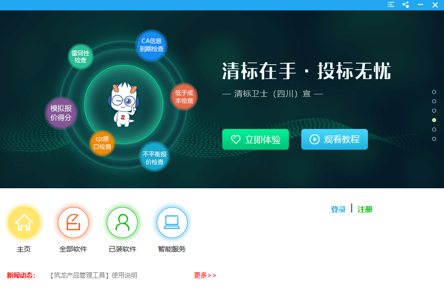 【筑龍產(chǎn)品管理工具】分四大模塊:【首頁(yè)】、【全部軟件】、【已裝軟件】、【智能服務(wù)】