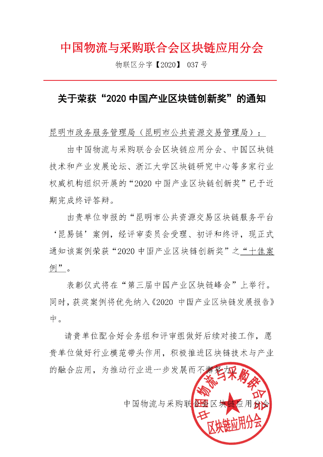 昆易鏈榮獲2020中國(guó)產(chǎn)業(yè)區(qū)塊鏈創(chuàng)新獎(jiǎng)”之“十佳案例”