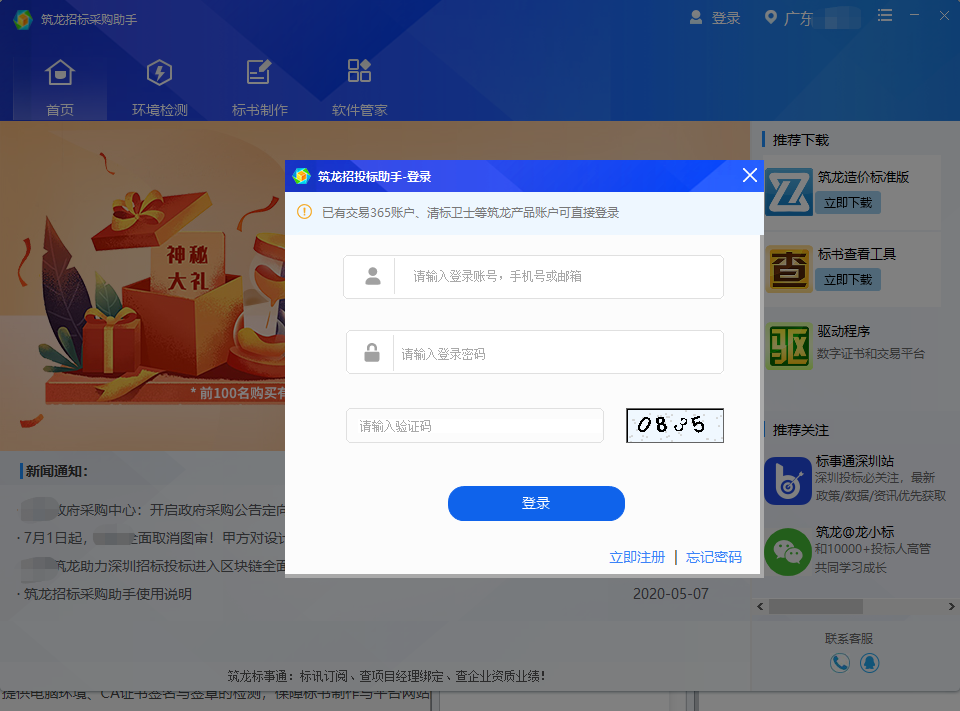 用戶運(yùn)行招標(biāo)采購(gòu)助手后,可在客戶端右上角點(diǎn)擊【登錄】按鈕進(jìn)行注冊(cè)或登錄,界面如下圖1-1所示: