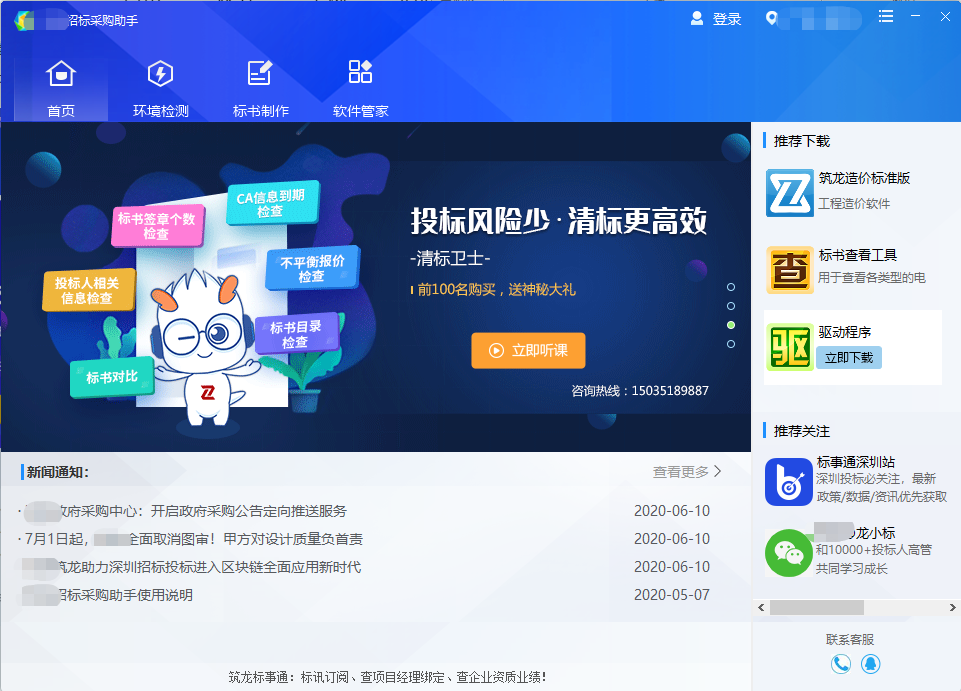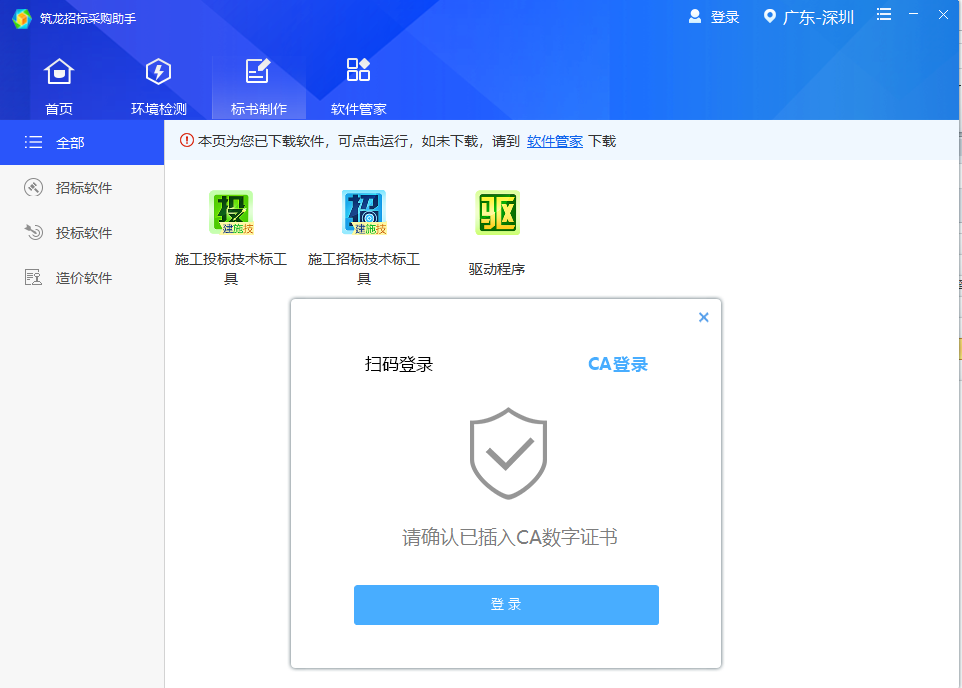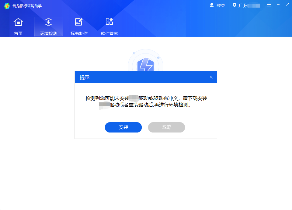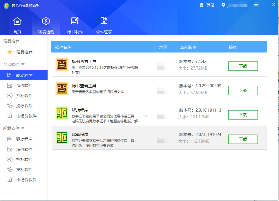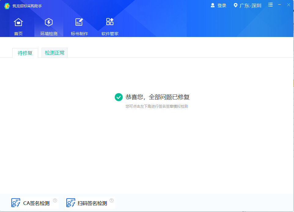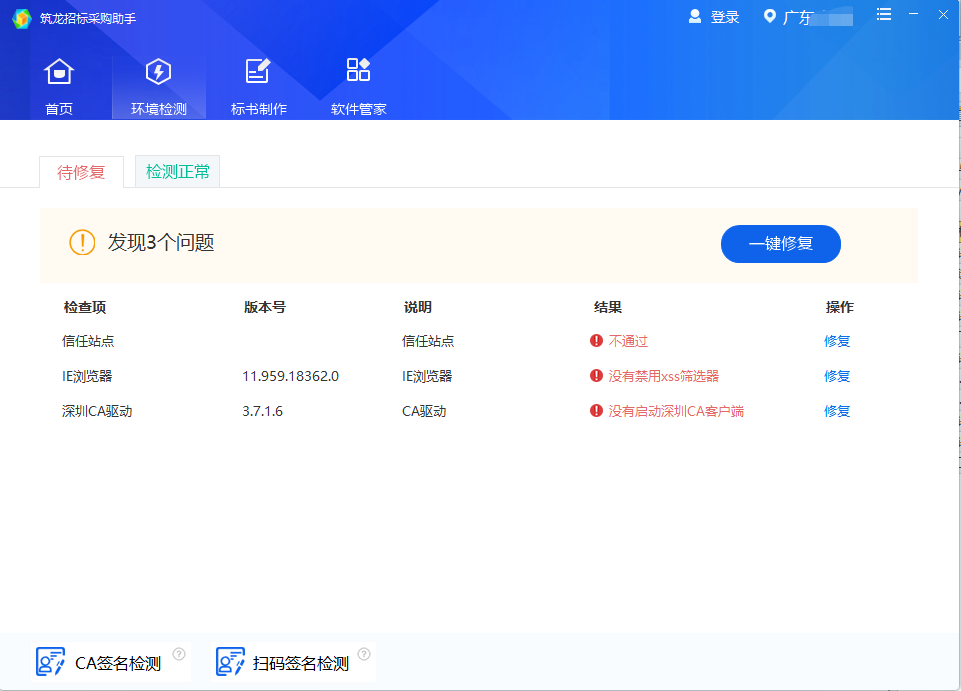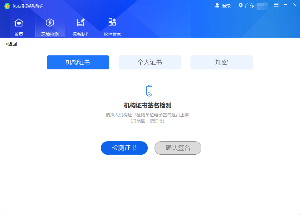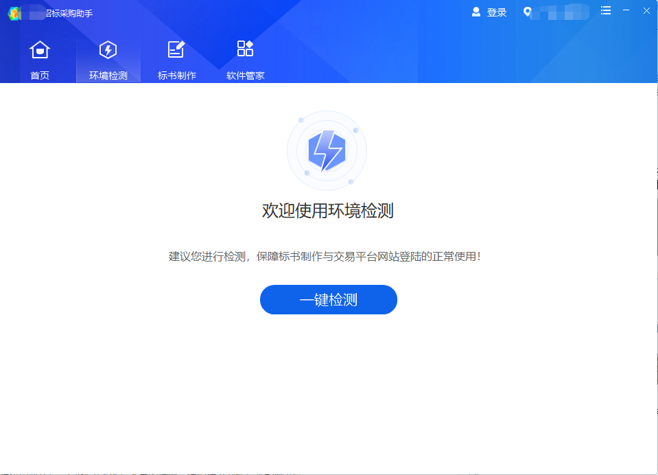 提供電腦環(huán)境、CA證書簽名與簽章的檢測(cè)與相應(yīng)的驅(qū)動(dòng)檢測(cè),保障標(biāo)書制作與平臺(tái)網(wǎng)站的正常使用。界面如下圖4-1所示: