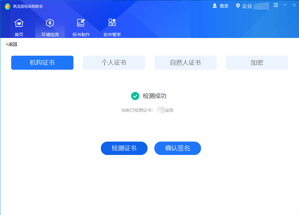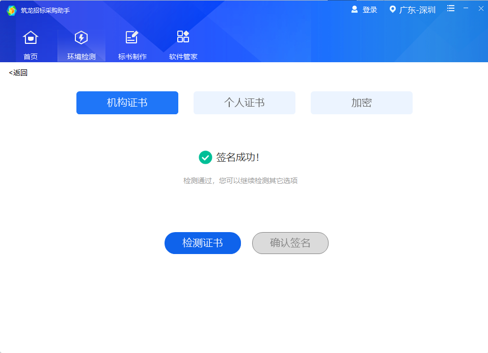 用戶可分別選擇機(jī)構(gòu)證書,個(gè)人證書和加密。其中機(jī)構(gòu)證書和個(gè)人證書分別用戶檢測(cè)機(jī)構(gòu)和個(gè)人(包括法定代表人,項(xiàng)目經(jīng)理,造價(jià)師)的簽名是否正常。而加密用于檢測(cè)證書加密是否正常。請(qǐng)插入對(duì)應(yīng)地區(qū)/企業(yè)的證書,然后點(diǎn)擊檢測(cè)證書,檢測(cè)證書成功界面如下圖4-7所示:
