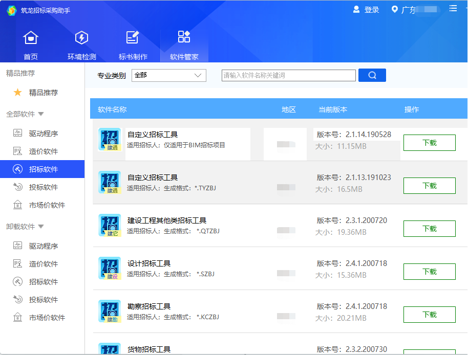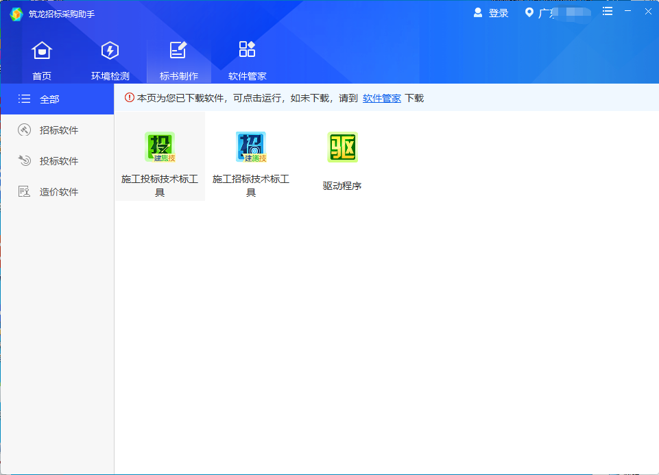 本頁(yè)為用戶已下載的軟件,包括招標(biāo)軟件,投標(biāo)軟件和造價(jià)軟件,點(diǎn)擊即可運(yùn)行。如果未下載標(biāo)書制作相關(guān)軟件,請(qǐng)點(diǎn)擊【軟件管家】,選擇所需軟件進(jìn)行下載。已下載的標(biāo)書制作相關(guān)的工具軟件將會(huì)分類展示,只需點(diǎn)擊相應(yīng)軟件進(jìn)入即可。界面如下圖5-1所示:
