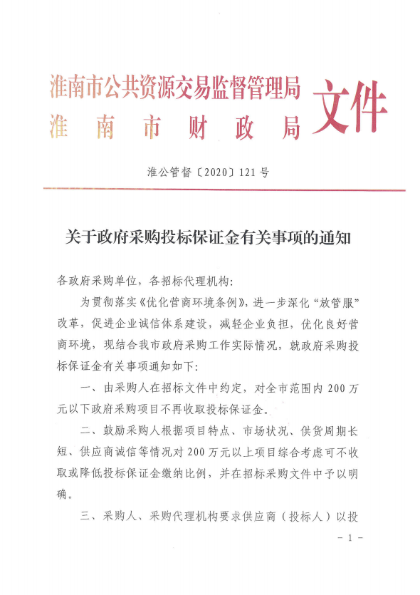 安徽省淮南市財(cái)政局、淮南市公共資源交易監(jiān)督管理局近日聯(lián)合發(fā)布《關(guān)于政府采購?fù)稑?biāo)保證金有關(guān)事項(xiàng)的通知》(以下簡稱《通知》),規(guī)定該市范圍內(nèi)200萬元以下政府采購項(xiàng)目不再收取投標(biāo)保證金,200萬元以上的項(xiàng)目鼓勵(lì)采購人根據(jù)項(xiàng)目特點(diǎn)、市場狀況、供貨周期長短、供應(yīng)商誠信等情況綜合考慮可不收取或降低投標(biāo)保證金繳納比例。