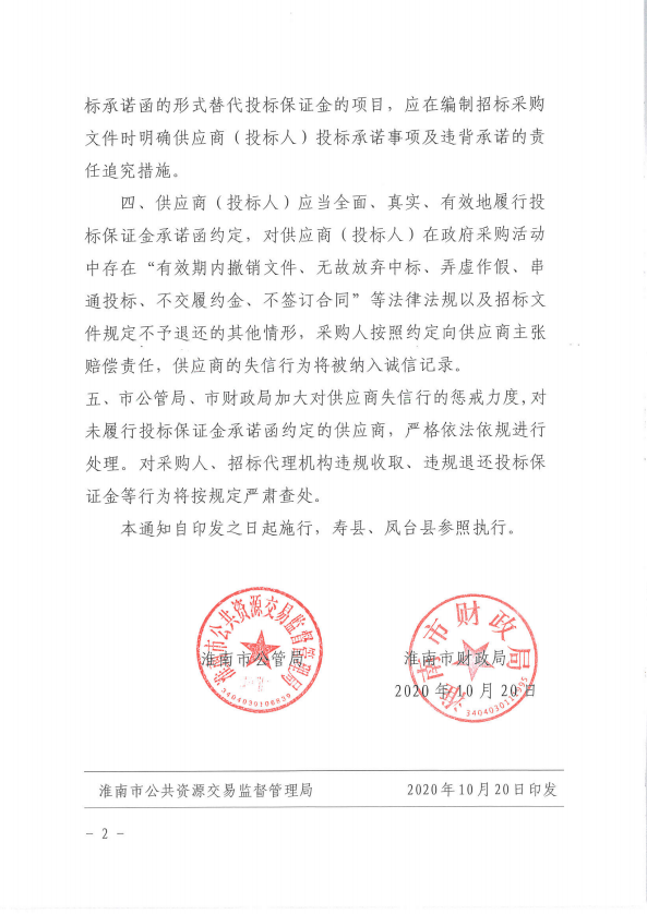 《通知》還指出,淮南市財(cái)政局、淮南市公共資源交易監(jiān)督管理局將加大對供應(yīng)商失信行的懲戒力度,對未履行投標(biāo)承諾函約定的供應(yīng)商,嚴(yán)格依法依規(guī)進(jìn)行處理。對采購人、招標(biāo)代理機(jī)構(gòu)違規(guī)收取、退還投標(biāo)保證金等行為依法嚴(yán)肅查處。