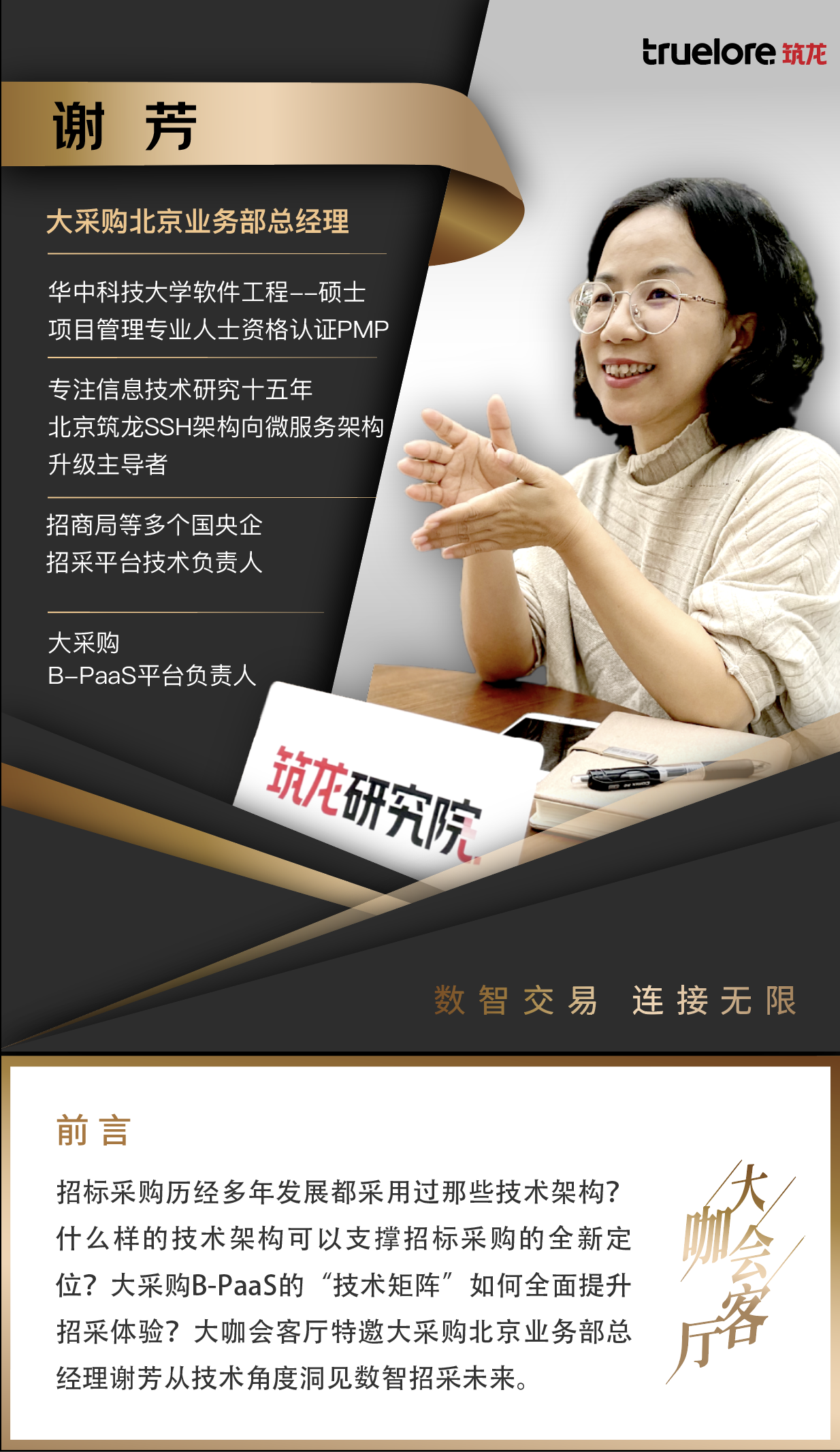 今天我們邀請到大采購北京業(yè)務(wù)部總經(jīng)理謝芳,請她結(jié)合自己在軟件技術(shù)前沿實踐分享一下招采信息化、數(shù)字化、智能化(以下簡稱三化)發(fā)展應(yīng)用情況以及 B-PaaS平臺如何實現(xiàn)更好的采購招標(biāo)戰(zhàn)略職能。謝總您好,歡迎來到大咖會客廳。我了解到您從事軟件開發(fā)工作已接近20年,見證參與了許多行業(yè)三化改造的全過程,您怎么看待我國整個軟件行業(yè)的技術(shù)架構(gòu)變遷?