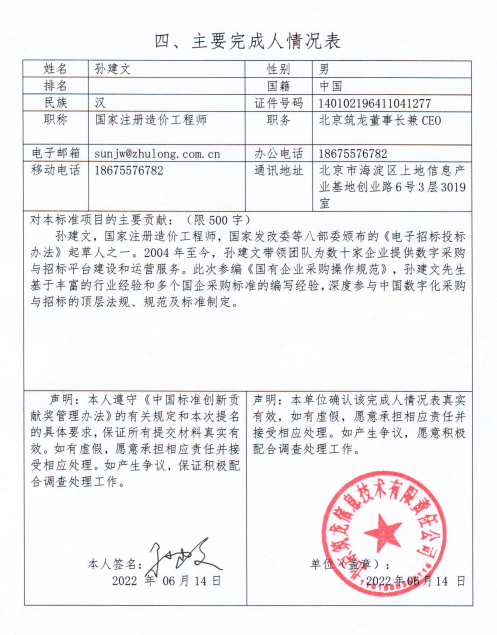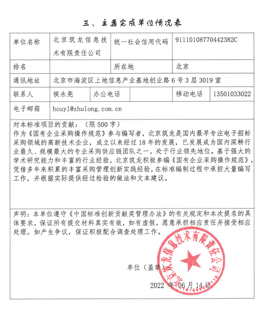 北京筑龍信息技術(shù)有限責(zé)任公司作為主要完成單位之一,并由我司董事長兼CEO孫建文作為主要完成人之一參與起草的T/CFLP 0016—2019《國有企業(yè)采購操作規(guī)范》團體標(biāo)準(zhǔn)擬申報“中國標(biāo)準(zhǔn)創(chuàng)新貢獻(xiàn)獎項目獎”。按照國家市場監(jiān)督管理總局《關(guān)于開展2022年中國標(biāo)準(zhǔn)創(chuàng)新貢獻(xiàn)獎提名工作的通知》(國市監(jiān)標(biāo)創(chuàng)函〔2022〕67號)要求,為進(jìn)一步聽取各方意見,現(xiàn)進(jìn)行公示,公示期為:2022年6月14日(或14日)日至2022年6月20日。(公示5個工作日)