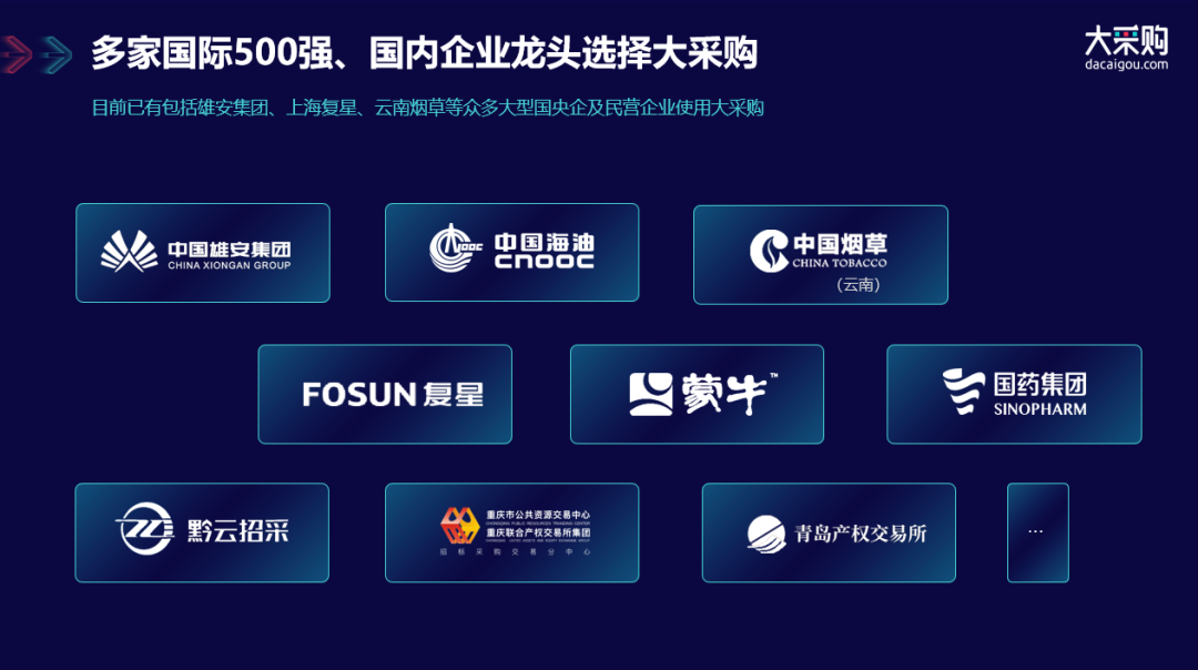 目前,企業(yè)級采購B-PaaS平臺大采購已有包括雄安集團(tuán)、上海復(fù)星、云南煙草、新疆交建投等眾多大型國央企及民營企業(yè)使用,基于大采購B-PaaS孵化出的針對不同行業(yè)的產(chǎn)品和服務(wù),助力企業(yè)加速實(shí)現(xiàn)數(shù)字采購的合規(guī)和智能,確保每一次采購安全、高效,助力企業(yè)采購供應(yīng)鏈先人一步。