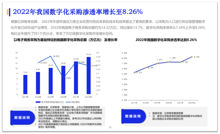 據(jù)《報(bào)告》中顯示,現(xiàn)階段我國(guó)數(shù)字化采購(gòu)市場(chǎng)發(fā)展動(dòng)力充足,2022年全國(guó)企業(yè)采購(gòu)規(guī)模超過173萬億元,數(shù)字化采購(gòu)率升至8.26%,相比去年提升了約1個(gè)百分點(diǎn),帶來了萬億級(jí)數(shù)字化采購(gòu)市場(chǎng)增長(zhǎng)空間。以采購(gòu)為入口進(jìn)行供應(yīng)鏈管理數(shù)字化升級(jí)已經(jīng)形成產(chǎn)業(yè)慣性。