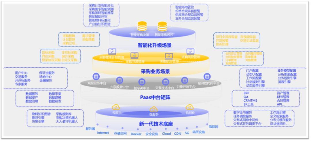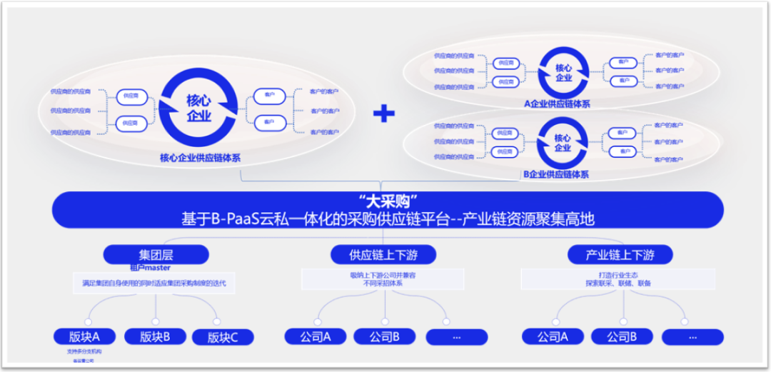 針對(duì)企業(yè)既要滿足標(biāo)準(zhǔn)化,又要滿足定制化業(yè)務(wù)需求,PaaS提供的服務(wù)更具有拓展性、集中性、適配性更強(qiáng)。“大采購(gòu)”云私一體化B-PaaS平臺(tái),既滿足多層級(jí)集中管理管控需求,又為下屬管理及執(zhí)行機(jī)構(gòu)提供更多個(gè)性化、自主性選擇,進(jìn)而適應(yīng)集團(tuán)集約化與分子公司個(gè)性化發(fā)展。